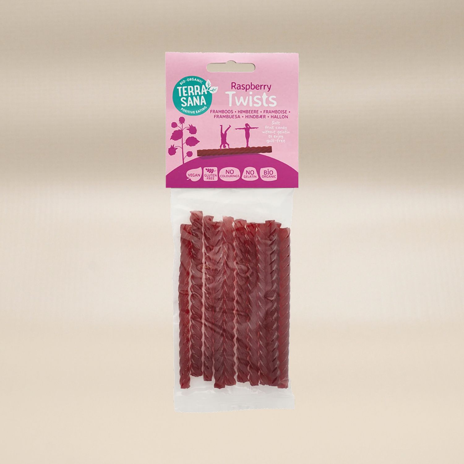 Mjuka ekologiska godissnören med hallonsmak. De har en lätt seg och mjuk konsistens och är gjorda med en kort ingredienslista. Twistsen är helt växtbaserade och innehåller varken gelatin, konstgjorda färgämnen eller artificiella aromer.